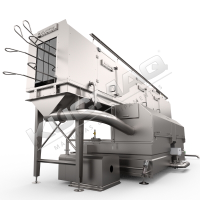 Acoplada a um aplicador de sabão KUCMAQ, que conta com escovas rotativas acionadas por motorredutores, a máquina de lavar gaiolas traz resultados ainda mais efetivos. Um sistema de exaustão completo para vapor e particulados resultantes do processo também pode ser adicionado.